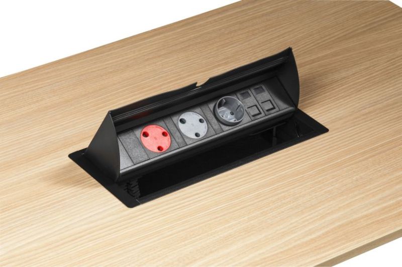 The Horizontal Powerdock makes use of the Optima extrusion by mounting it horizontally within the work surface and giving it the ability to tilt up, exposing the sockets and peripherals to the surface.