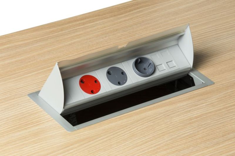 The unit can be closed while the plugs are still attached to the outlets freeing up valuable work-surface space. A rubber flap allows for cables to exit the unit whilst in the closed position. It features a great selection of power, voice and data connections to suit any requirement and is perfect for the office environment.